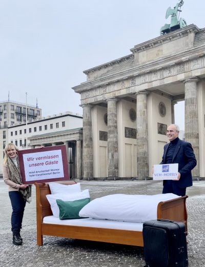 Mit einem Augenzwinkern machen die Hotels VCH-Hotel Amalienhof in Weimar und VCH-Hotel Carolinenhof in Berlin gemeinsam mit dem VCH aufmerksam auf die aktuelle Situation. Unter dem Motto „Wir vermissen unsere Gäste“ wurde kurzerhand ein Bett vor dem Brandenburger Tor aufgebaut und als Fotomotiv festgehalten, um dies kurzfristig für weitere Medienaktivitäten zu nutzen. Mehrere vorbei laufende Passanten stimmten zu: wir wollen wieder reisen und kommen gern zu Euch!